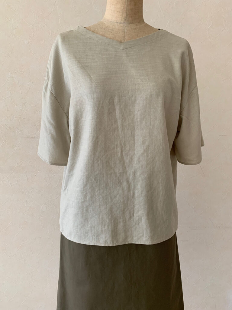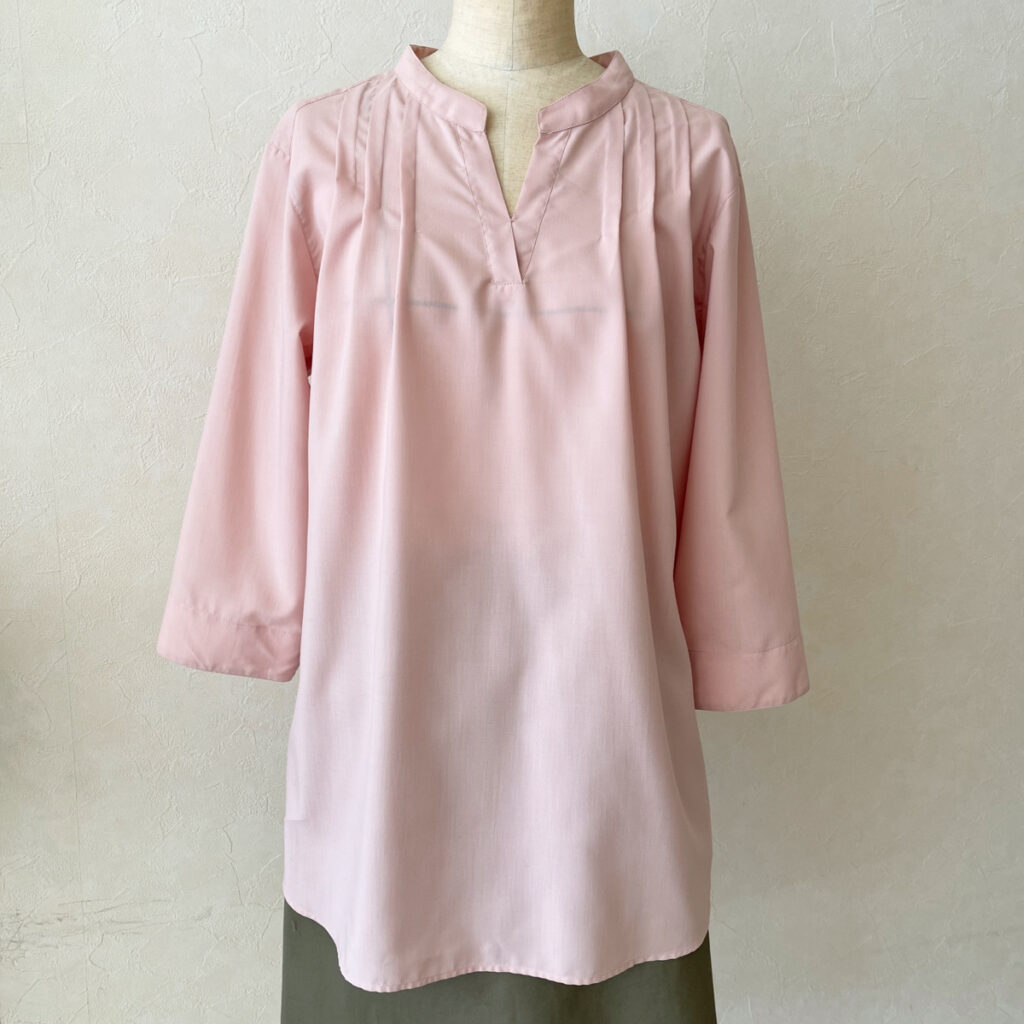 「ベーシックⅠ」課題1の「セットインスリーブのブラウス」を基本に、ピンタックをふんだんにあしらったデザイン。ゆったりとしたシルエットです。