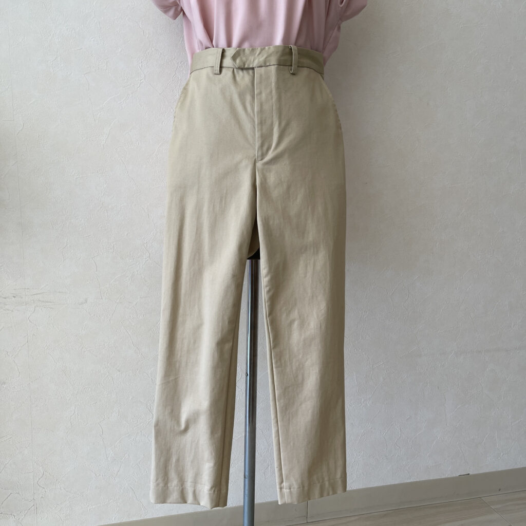 見返し、持ち出し付きの前開きファスナー仕立てを学びます。サブリナ丈、スリムパンツのシルエットのパンツです。
